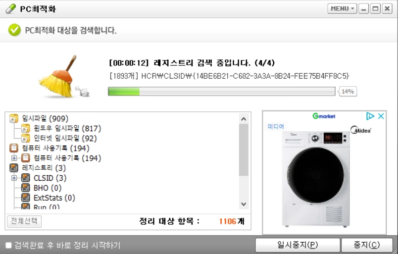 - 레지스트리 검색이 끝나면 정리시작 버튼 클릭