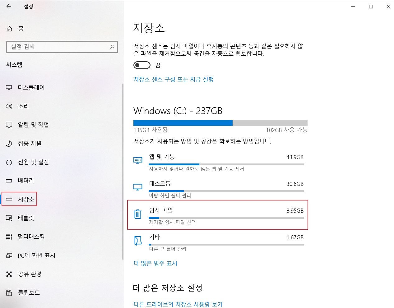 내 컴퓨터의 설정에서 저장소 임시 파일을 제거하는 방법입니다. 디스크 정리를 통해서 저장 공간을 늘렸다고 해도 임시파일을 확인해보면 여전히 불필요한 파일이 많은 것을 알 수 있습니다. 아래와 같은 과정을 통해 이 임시파일을 완벽하게 제거할 수 있습니다.