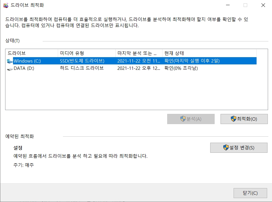 - 조각난 파일이 있는지 확인하고 최적화 버튼을 클릭