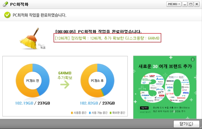 제 컴퓨터의 레지스트리를 정리하니 무려 644MB의 추가 용량을 확보할 수 있었습니다.