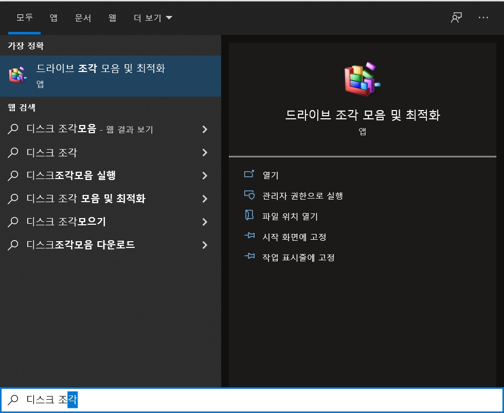 - 디스크 조각 모음 이라고 검색을 하고 열기를 누른다
