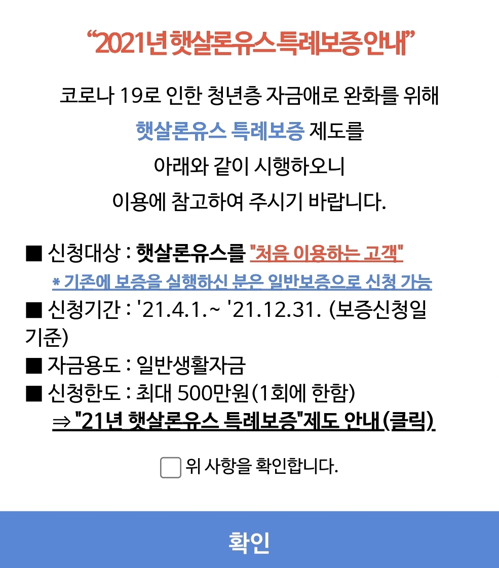 하지만 특례보증은 코로나 19 로 인하여 청년층이 겪고있는 경제적 어려움을 햇소하기 위해 시행되는 상품입니다. 2021년 4월부터 2021년 12월 31일까지 햇살론 유스를 처음으로 이용하는 사람에 한해 일반생활자금의 한도를 300만원에서 500만원으로 상향하여 지원되는 것입니다.