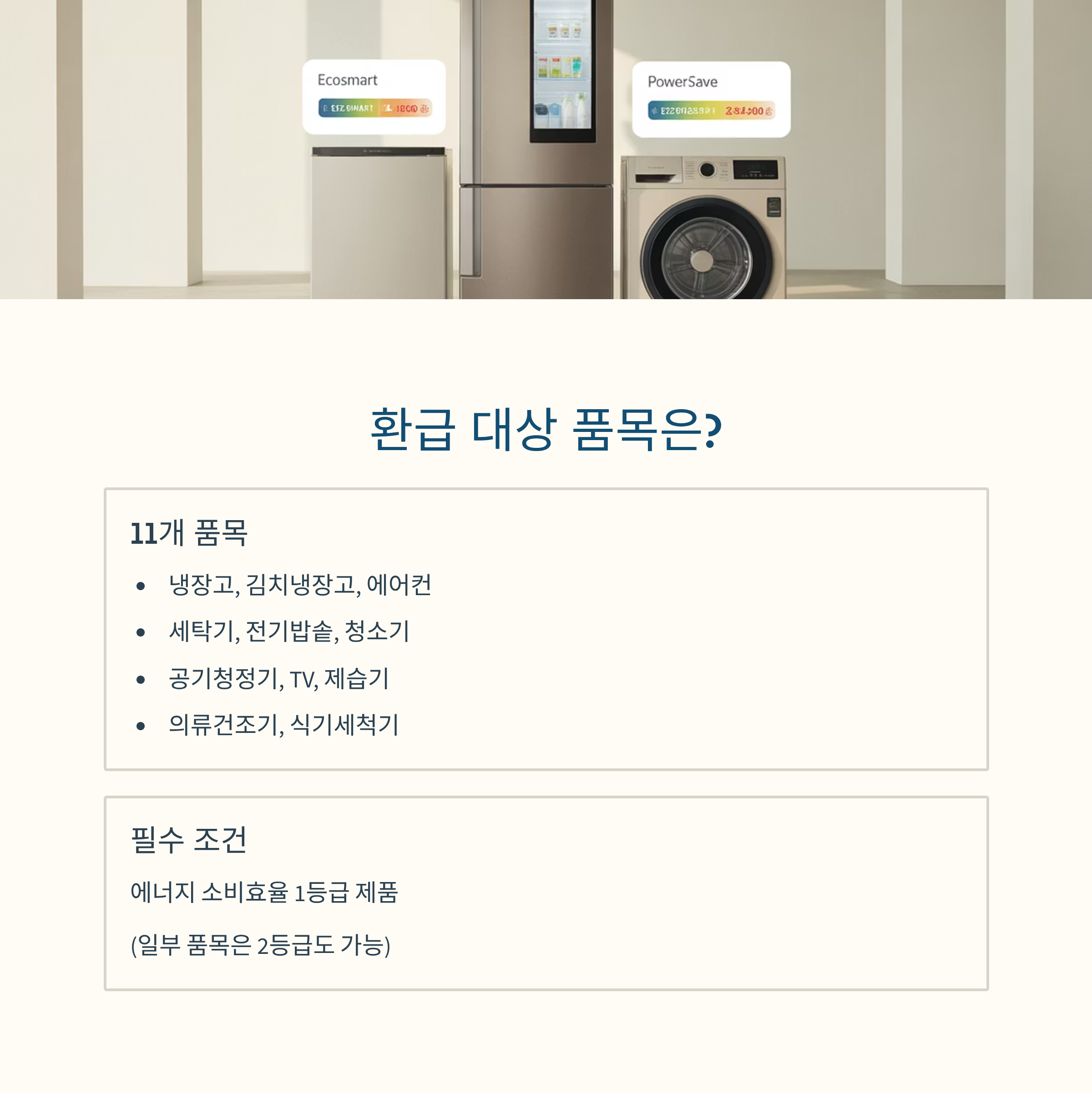 총 11개 품목이 환급 대상이에요. 냉장고, 김치냉장고, 에어컨, 세탁기, 전기밥솥, 유선진공청소기,